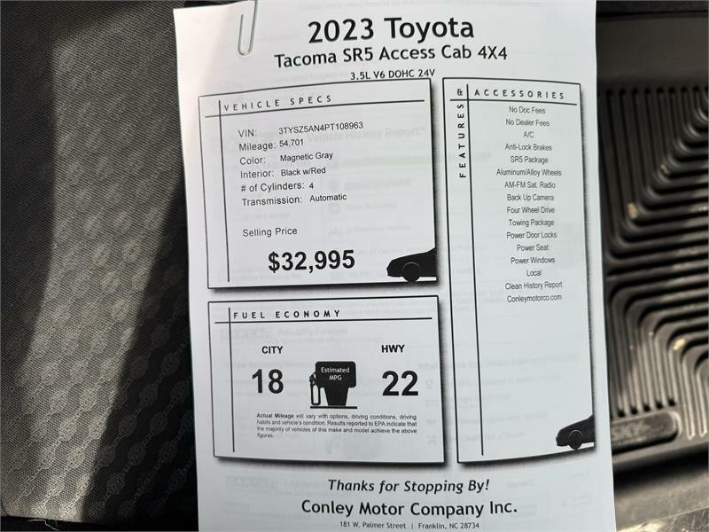 Conley Motor Company Inc. attempts to provide accurate information on the automobile listed above. The actual equipment may vary. Please confirm all vehicle options, accessories and prices with a sales associate to assure accuracy. This information is provided without representations or warranties of any kind, either expressed or implied. Prices do not include additional fees such as government fees and taxes, title and registration fees, finance charges, dealer document preparation fees, and emission testing