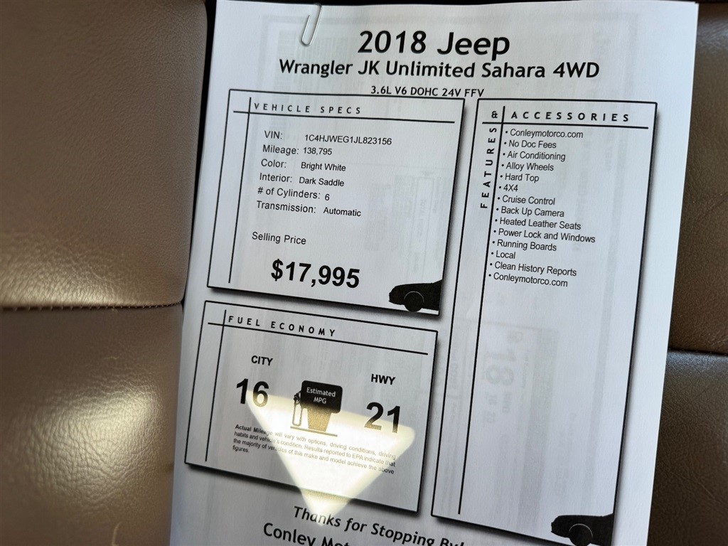 Conley Motor Company Inc. attempts to provide accurate information on the automobile listed above. The actual equipment may vary. Please confirm all vehicle options, accessories and prices with a sales associate to assure accuracy. This information is provided without representations or warranties of any kind, either expressed or implied. Prices do not include additional fees such as government fees and taxes, title and registration fees, finance charges, dealer document preparation fees, and emission testing